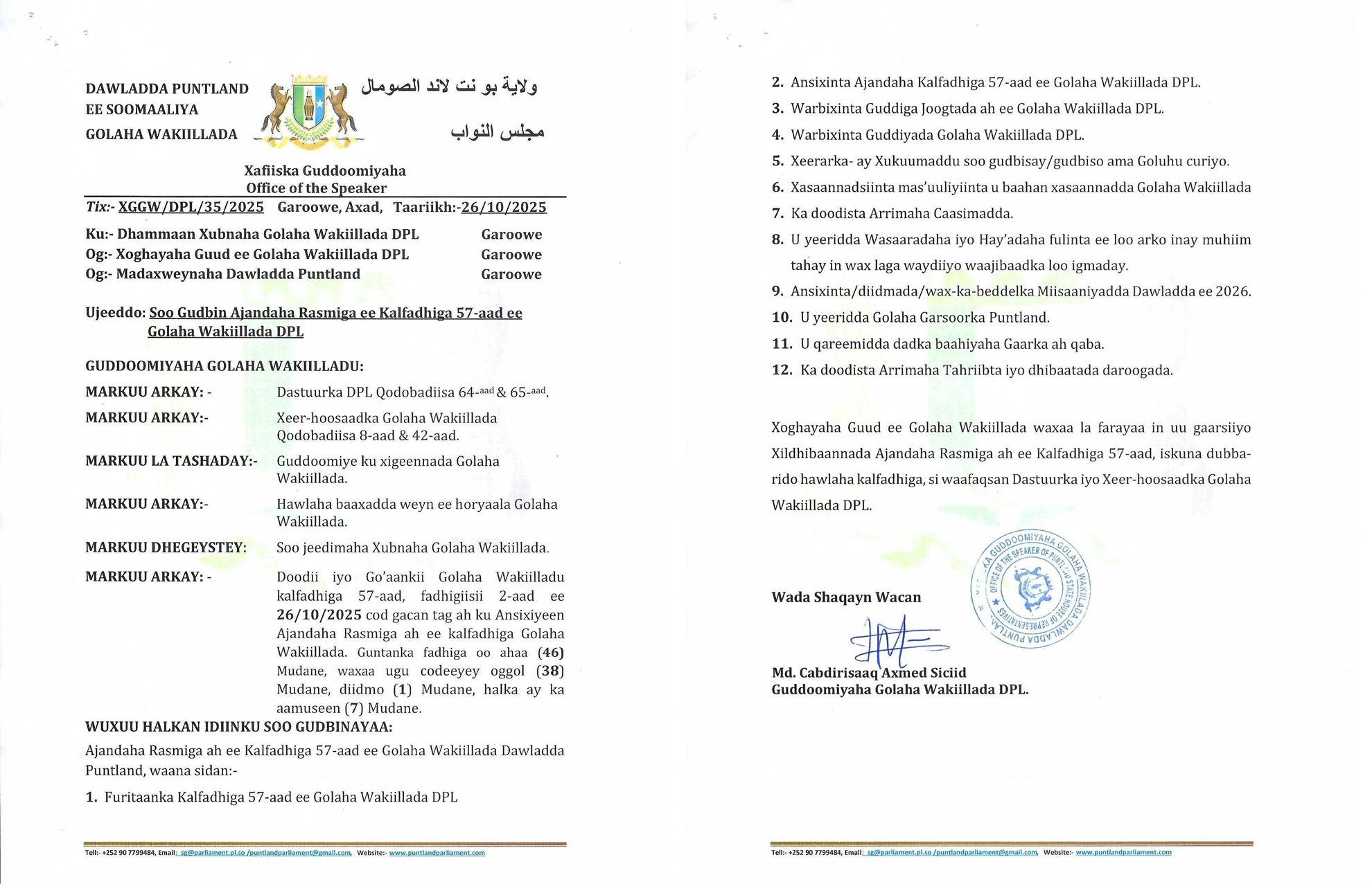 Ajandaha rasmiga ah ee Kalfadhiga 54-aad Golaha Wakiillada Dawladda Puntland